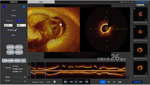 恒宇和藍(lán)藍(lán)設(shè)計(jì)合作,對OCT系統(tǒng)UI操作界面進(jìn)行了創(chuàng)新,采用的UI界面結(jié)合了16:9寬屏優(yōu)勢,搭載了管腔識別、支架識別、三維重建、造影融合等功能,軟件簡潔直觀的界面和多功能算法可幫助術(shù)者快速精準(zhǔn)的做出診療決策,更符合國內(nèi)醫(yī)生界面操作習(xí)慣,從而優(yōu)化醫(yī)生和病人的診療體驗(yàn)。