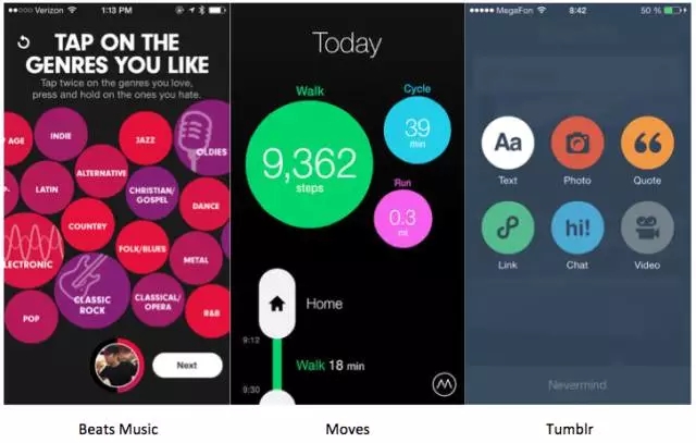 Beats Music把選擇喜歡的標(biāo)簽設(shè)計(jì)成了圓形,這就比普通的列表、矩形tag的感覺(jué)要好很多,更加趣味更具探索性。Movse每天走的步數(shù)、消耗的卡路里均用圓形承載,是數(shù)據(jù)可視化、關(guān)鍵信息顯性化的最好案例。Tumblr則把要?jiǎng)?chuàng)建的內(nèi)容的類型選擇,用蒙層+圓形選項(xiàng)按鈕來(lái)設(shè)計(jì),讓選擇變得專注而明確,又不那么死板。