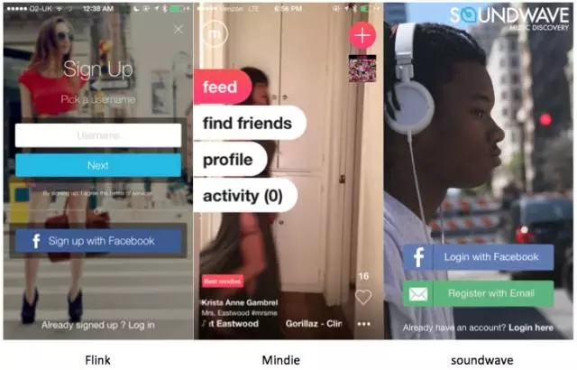 大視野背景圖風(fēng)格也分為兩種,一種像Secret、The Whole Pantry這樣的,內(nèi)容區(qū)塊中采用大視野背景圖,好處是可以利用圖片做區(qū)塊分割,難度是圖片拼接后的效果不一定好看,所以可能還需要配合描邊、留白等設(shè)計(jì)手段優(yōu)化拼接。另外一種就是想Vsco、Flink、Mindie、Soundwave這樣的,全屏背景圖甚至打通狀態(tài)欄,前景做內(nèi)容排版、導(dǎo)航、操作。好處是設(shè)計(jì)非常具有生命了,所有有朋友把這種風(fēng)格也叫有計(jì)劃設(shè)計(jì),說(shuō)的就是回歸大自然的設(shè)計(jì)手法。但風(fēng)險(xiǎn)也是很明顯的,就是前景的信息排布設(shè)計(jì)其實(shí)是有很大挑戰(zhàn)的,必經(jīng)花花綠綠的背景太過(guò)于干擾注意力,導(dǎo)致前景的文字內(nèi)容可讀性會(huì)變?nèi)酢K孕枰阎匾僮饔妹鞔_的按鈕區(qū)隔出來(lái),閱讀型文字跟背景圖要用明顯的反色,還是不行的話就把文字浮在半透明蒙層上,解決可讀性問(wèn)題。