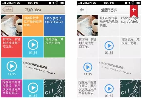 可是對(duì)于一些內(nèi)容型的APP,也許并不適用,比如GoogleKeep的多彩卡片,確實(shí)是在內(nèi)容閱讀上會(huì)起到反效果。百度云記事本第一版設(shè)計(jì)也是多彩色的,但是后來(lái)考慮到文字記事比較多,為提供良好的文字閱讀體驗(yàn),還是把多彩色改成灰白色微質(zhì)感的設(shè)計(jì)。