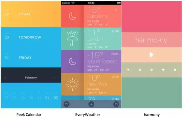 而Peek Calendar、EveryWeather和Harmony這三個(gè)APP,是列表多彩色的設(shè)計(jì)案例,這種列表多彩色,不知道是不是從Clear開始再度流行起立的,用鮮亮的多彩色來(lái)區(qū)分信息,確實(shí)能起到突出的效果,視覺(jué)上極其醒目。