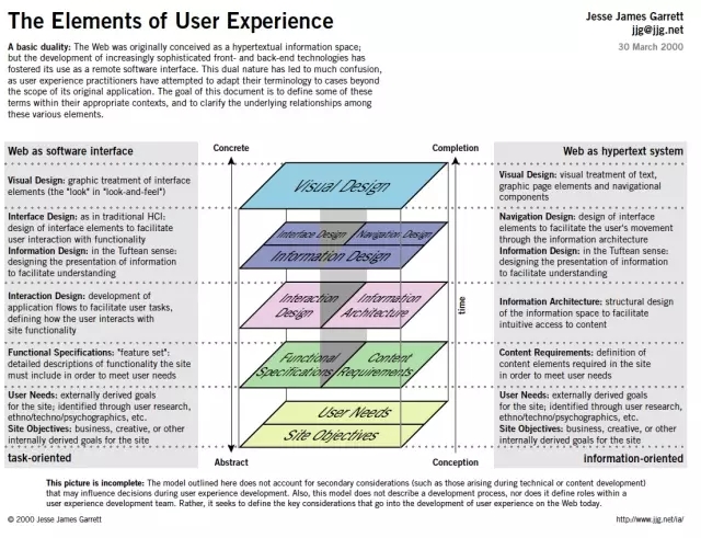 想了解 UI/UX,就一定要了解這張圖,這是 Jesse James Garrett 在2000年發(fā)表的用戶經(jīng)驗元素一書中所提出:使用者的經(jīng)驗可分成抽象到具體,也就是由策略、范圍、結(jié)構(gòu)、骨架、表層所構(gòu)成。
