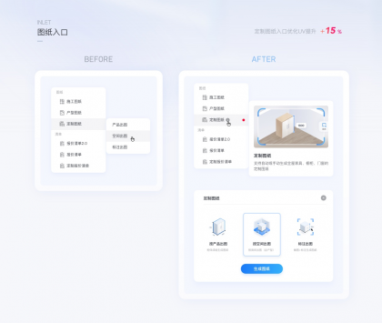 在新版優(yōu)化中圖形化的表達了圖紙類型的差異,即便增加了流程步驟數(shù),最終用戶點擊圖紙的UV提升了15%,此案例可以說明,更精準有效的對象表達能吸引更多用戶來使用此功能,對業(yè)務產(chǎn)生直接效果。