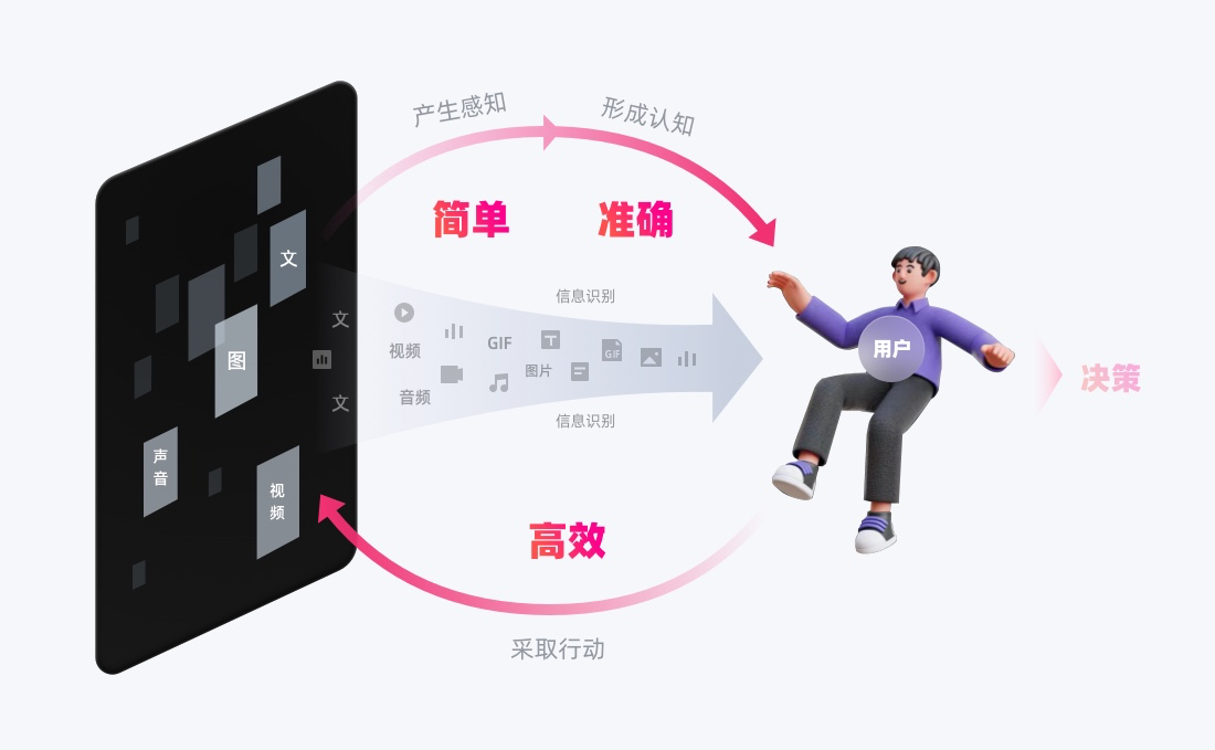 信息識別,可簡單理解為:感知到(看到/聽到)信息,并能夠理解它。本質是在用戶與界面交互中,會經(jīng)歷「感知信息→認知信息→做出決策與行動」的歷程,從感知到認知,是信息獲取和辨識理解的過程,即「信息識別」。