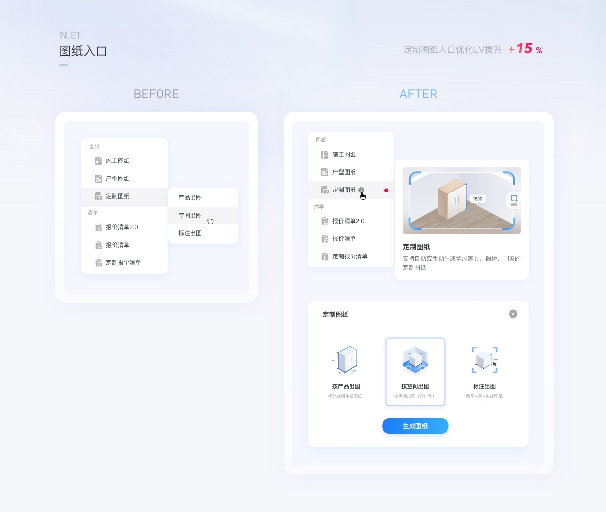 在新版優(yōu)化中圖形化的表達了圖紙類型的差異,即便增加了流程步驟數(shù),最終用戶點擊圖紙的UV提升了15%,此案例可以說明,更精準有效的對象表達能吸引更多用戶來使用此功能,對業(yè)務產(chǎn)生直接效果。