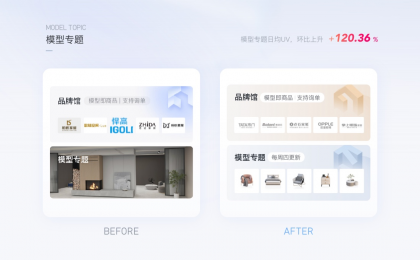 群核下的設計工具,以專題化的形式聚類商家、平臺推薦的模型是基本的運營動作,如下圖,原本以真實效果圖的方式展示模型專題,用戶難以感知是方案還是模型。通過封面圖形的優(yōu)化:將核心的模型類型展示出來,用戶能夠預見里面的內(nèi)容。
