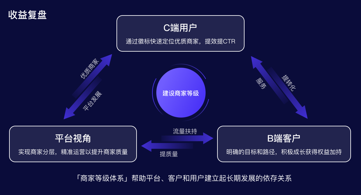 平臺(tái)通過建設(shè)商家等級(jí),將商家分層并提供適配的服務(wù),實(shí)現(xiàn)了精準(zhǔn)運(yùn)營(yíng);商家等級(jí)給商家?guī)淼臋?quán)益吸引和任務(wù)引導(dǎo),促進(jìn)了商家活躍度和質(zhì)量的大幅提升;C端披露的等級(jí)徽標(biāo)幫助用戶快速鑒別優(yōu)質(zhì)商家,頁面的CTR有顯著的正向增長(zhǎng),商業(yè)生態(tài)下的商家等級(jí)激勵(lì)體系已初步建成。但后期在做客戶訪談的過程中,有客戶反饋某些權(quán)益感知度比較弱。權(quán)益是吸引商家的核心驅(qū)動(dòng)力,如何圍繞權(quán)益建設(shè)開展有效的設(shè)計(jì)?這是應(yīng)該是接下來需要展開研究的課題。