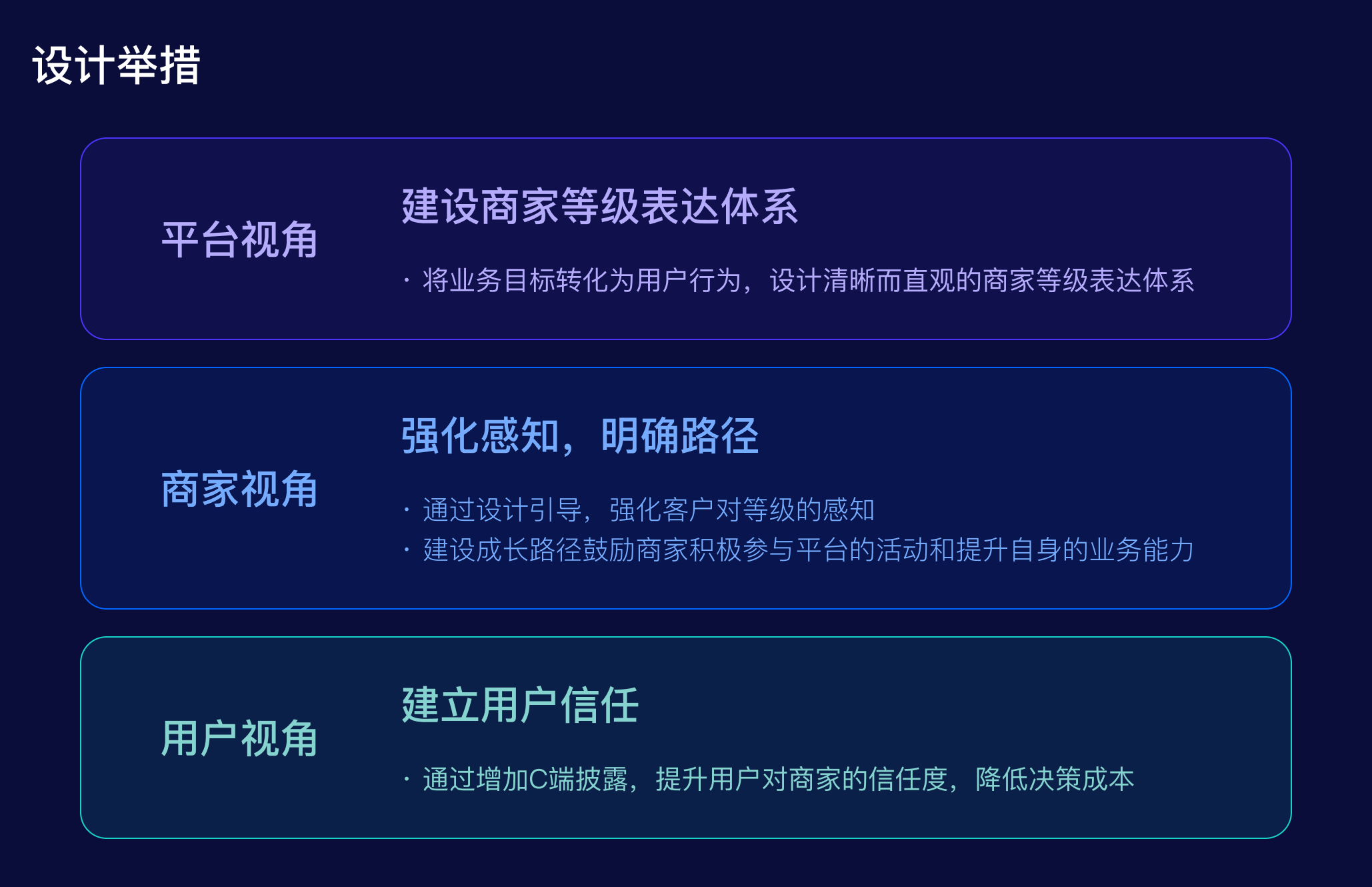 綜合以上分析,設(shè)計(jì)舉措應(yīng)注重建立商家等級(jí)表達(dá)、強(qiáng)化商家的感知和增強(qiáng)用戶的信任。希望通過設(shè)計(jì)目標(biāo)的實(shí)現(xiàn),為商家分層模型帶來更好的用戶體驗(yàn)和商業(yè)效益,提升商家的參與度和忠誠(chéng)度,促進(jìn)商業(yè)生態(tài)飛輪的正向運(yùn)轉(zhuǎn)。
