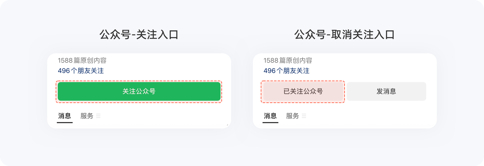 有時(shí)候,出于商業(yè)化的目的,同一個(gè)選項(xiàng)在二次操作時(shí),產(chǎn)品會(huì)刻意增加用戶操作成本,以降低選擇效率,看似??硕傻姆聪虿僮?,卻一定程度地降低了用戶退出率,實(shí)則對(duì)產(chǎn)品有益。例如,在關(guān)注微信公眾號(hào)之前,非常醒目的關(guān)注按鈕觸手可及,可關(guān)注之后,弱化的幽靈按鈕及文案,很難一眼看出這就是取消關(guān)注入口,需要用戶花費(fèi)額外的時(shí)間去理解或試錯(cuò)方可取關(guān),這么做能降低公眾號(hào)粉絲的取關(guān)量。為公眾號(hào)留住粉絲,更是對(duì)內(nèi)容認(rèn)可的一種支持,后面的良性循環(huán)無需多講。