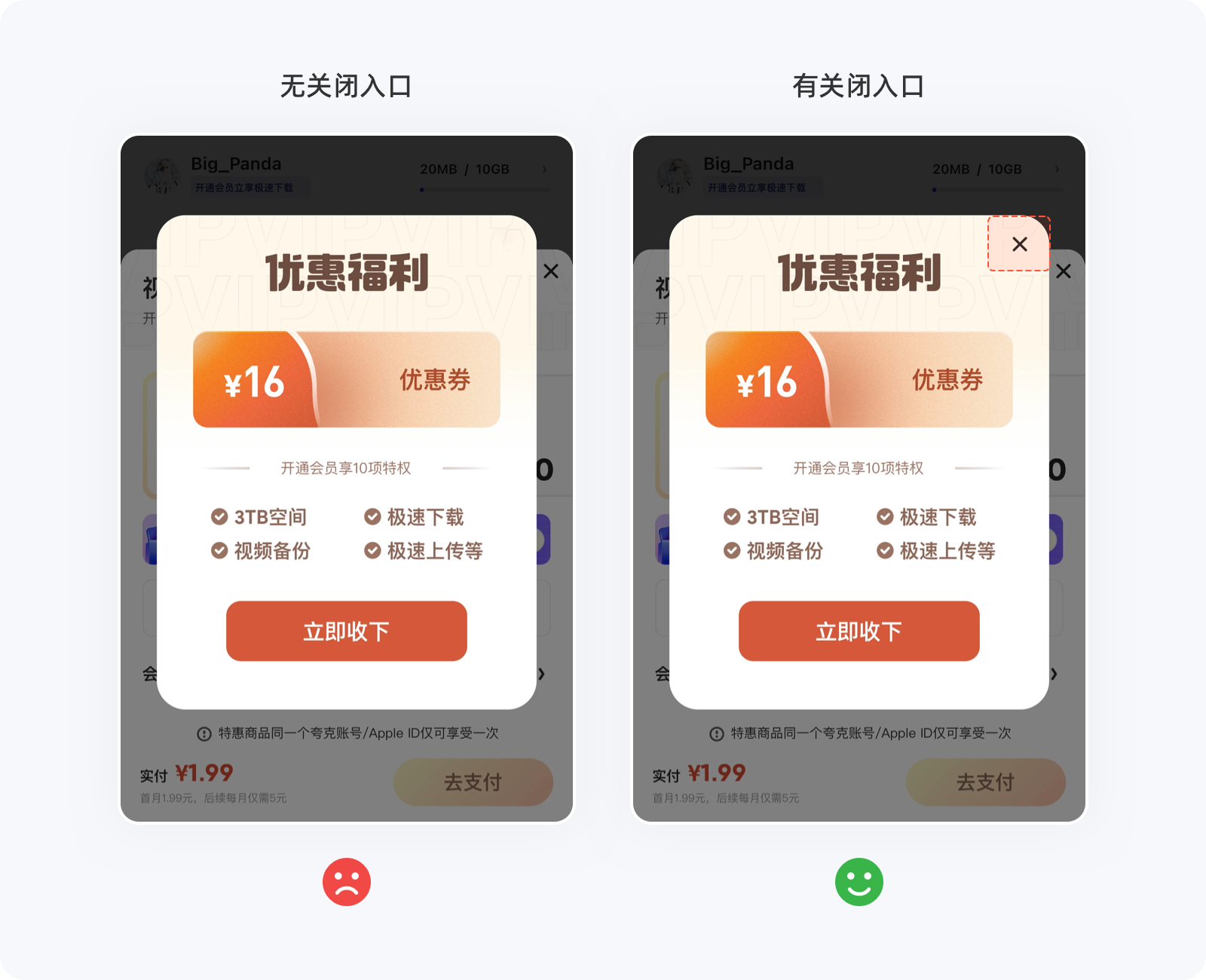 ??硕梢龅氖峭ㄟ^減少用戶做決定的時(shí)間,來提升轉(zhuǎn)化率以及用戶體驗(yàn),但不管在什么情況下,用戶都希望自己還擁有選擇的權(quán)利,如果設(shè)計(jì)師自作聰明的將選項(xiàng)減到只剩一個(gè),就相當(dāng)于告知用戶必須接受,那么用戶就有種被強(qiáng)制、綁架的感覺,只會(huì)存在兩個(gè)結(jié)果:①被你的產(chǎn)品拿捏、②離開你的產(chǎn)品,筆者相信第一種可能性的概率極低,畢竟同類型的產(chǎn)品并不是只有你一家(壟斷除外)。如下圖的彈窗,用戶即便不愿意進(jìn)入任務(wù)流程,可別無選擇,只能進(jìn)入后再返回才能回到原位,這種做法無端增加用戶的操作成本,極易引起反感情緒。不管產(chǎn)品如何希望用戶轉(zhuǎn)化,切不可強(qiáng)制他們接受,需要給用戶留一條返回的“路”,即便不那么起眼,至少還有選擇的權(quán)利。