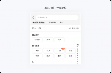 另外,我們?cè)谶x擇地址時(shí),如果將所有城市一股腦平鋪在界面上,用戶想要選擇自身所需,則需要花費(fèi)大量的時(shí)間。對(duì)城市進(jìn)行了分類分層,以及有了搜索歷史、熱門城市以及右側(cè)的首字母索引后,用戶就能通過不同維度快速找到想找的城市,選擇效率直線上升。