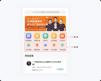 在設(shè)計(jì)過程中,如果沒有對(duì)功能層級(jí)進(jìn)行劃分,一股腦地將所有功能入口平鋪的話,就需要用戶花費(fèi)大量的時(shí)間和精力來查找需要的功能,無疑是一場災(zāi)難。我們可以通過希克定律來優(yōu)化界面功能布局,根據(jù)業(yè)務(wù)的重要性對(duì)功能入口進(jìn)行分類組合,減少用戶的認(rèn)知及理解成本,以便快速達(dá)到目的。