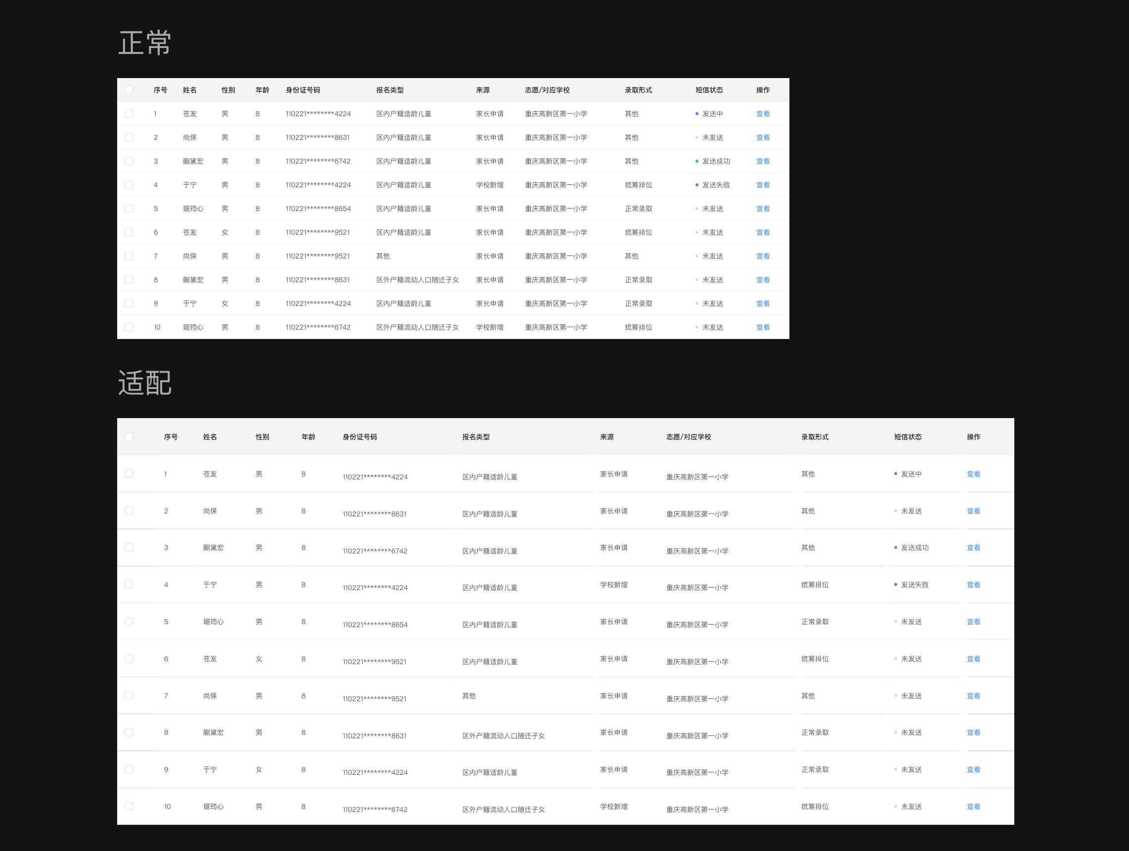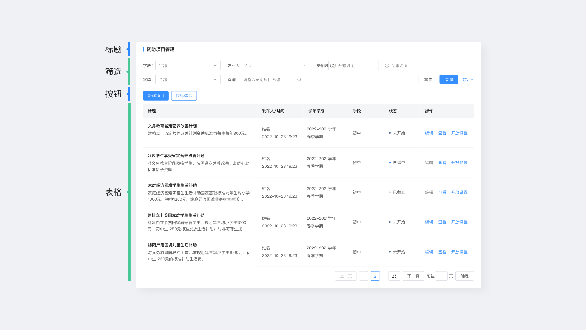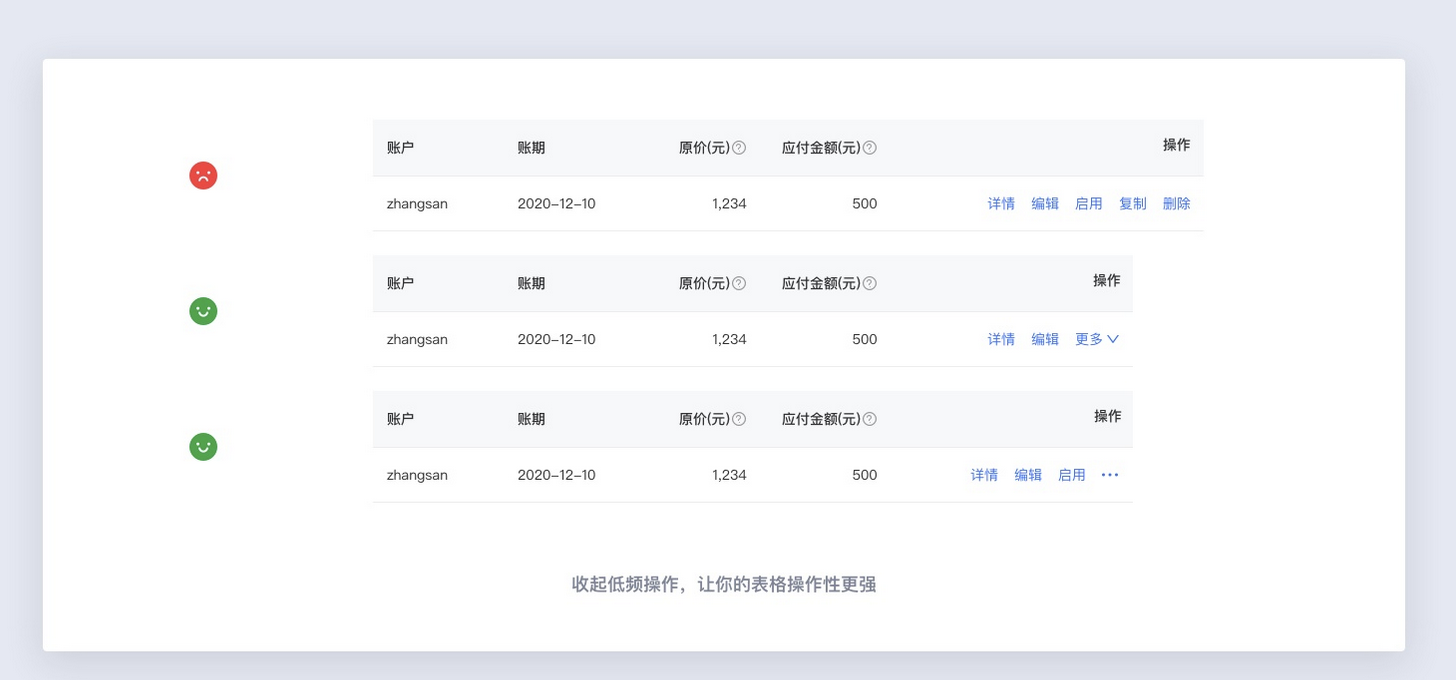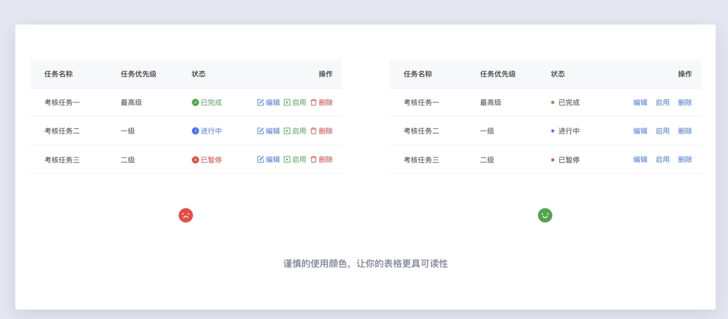 表格設(shè)計(jì)中一定不要使用過多的顏色區(qū)做狀態(tài)或操作的區(qū)分,過多的顏色細(xì)分會(huì)使表格變得更加混亂,影響用戶體驗(yàn)。對(duì)狀態(tài)的區(qū)分,僅用輕量的顏色區(qū)分即可,操作欄保持主色按鈕色。
