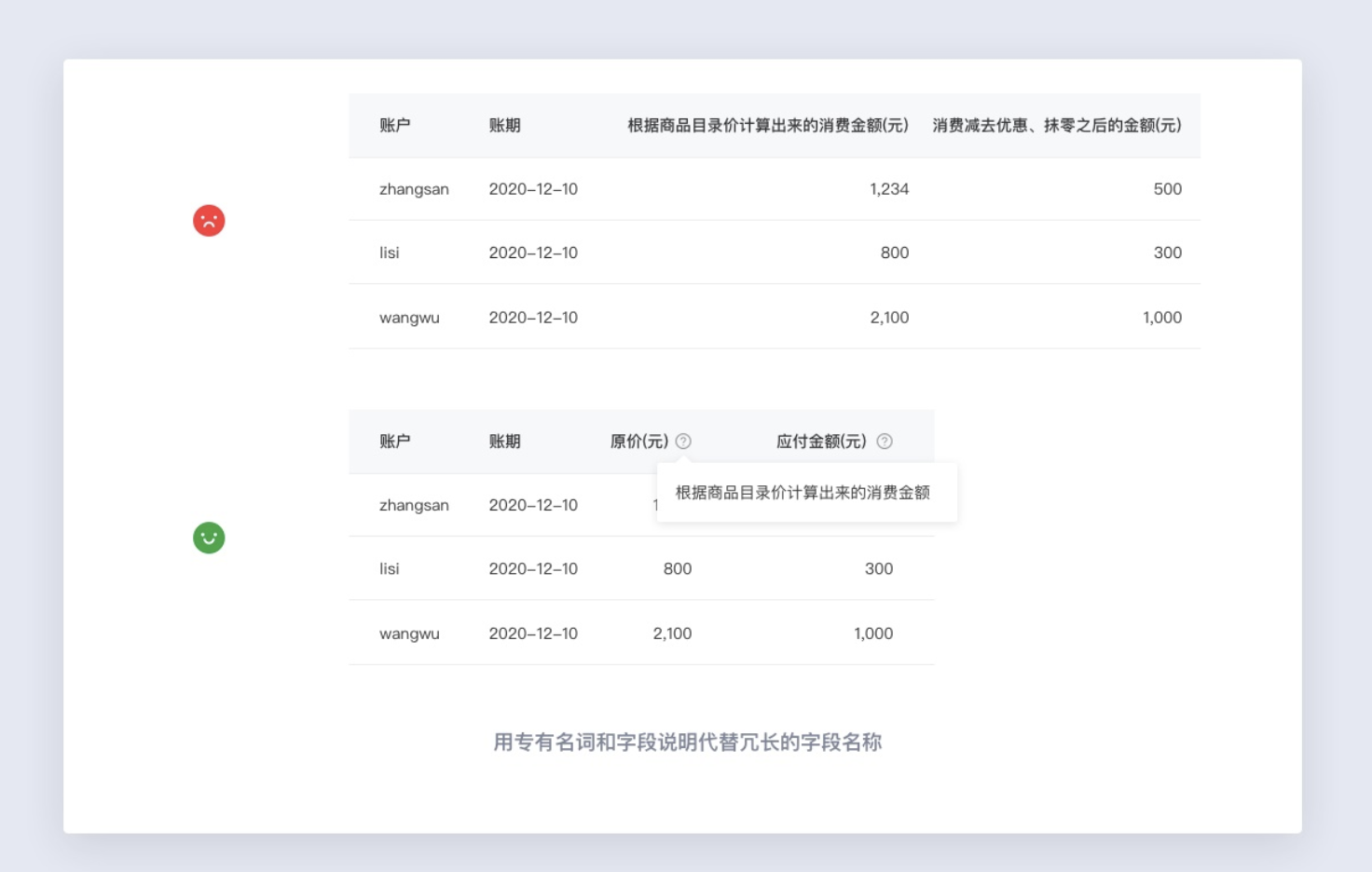 當(dāng)字段名稱過長,又必須展示,才能有效的理解字段含義時(shí)。我們可以定義一個(gè)專有名詞代替,并且在字段名稱后使用添加字段說明的形式,來對(duì)字段加以說明。這樣一來用戶既可以清晰的理解字段含義,又可以在有限的頁面空間下獲取到更多的數(shù)據(jù)信息。