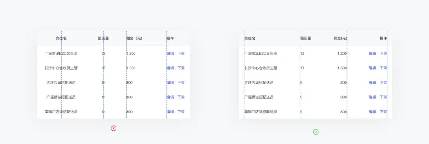 操作右對(duì)齊:操作即使沒有縱向分割線也能很好的起到分隔的作用,視覺上看表格是一個(gè)方方正正的格子,比較整齊