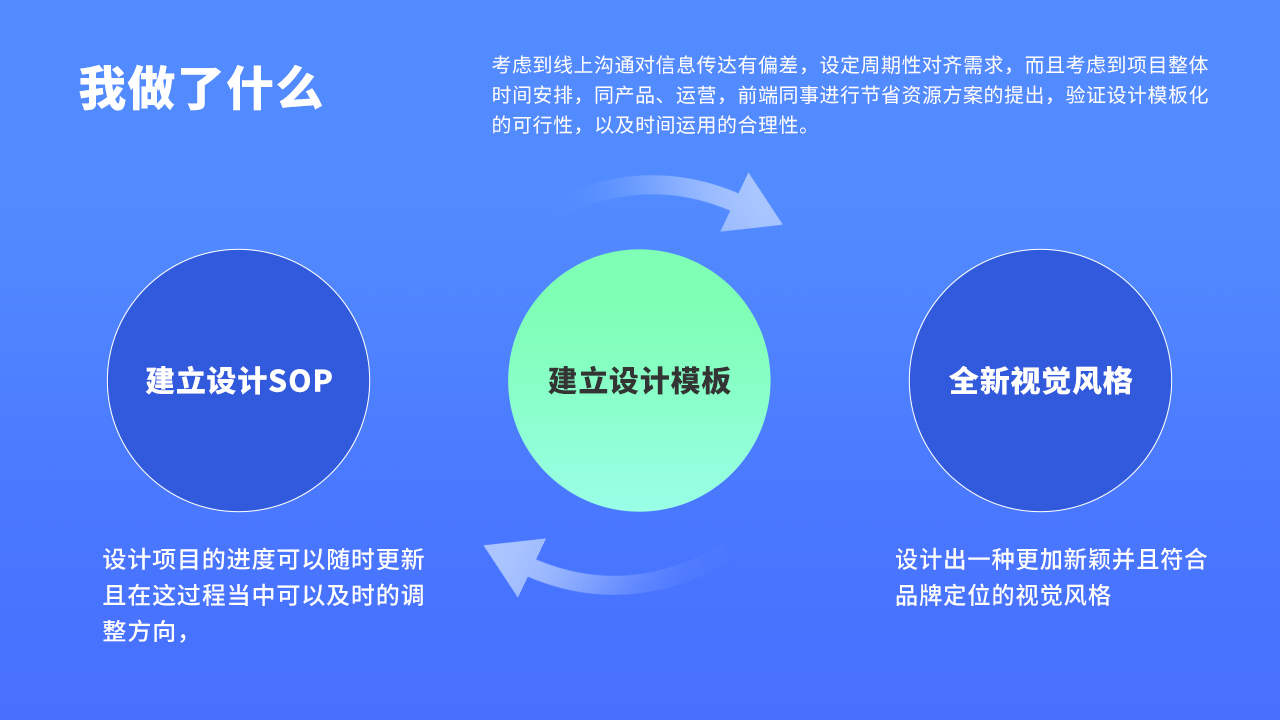 陳述參考:因為考慮到本次活動改版比較特殊,而且是多個部門協(xié)同合作,因此我考慮到后續(xù)美術(shù)整合的時候可能出現(xiàn)方向出現(xiàn)偏差,因此我建立了設(shè)計流程,設(shè)計項目的進度可以隨時更新且在這過程當(dāng)中可以及時的調(diào)整方向,確保大家目標(biāo)一致,規(guī)避風(fēng)險。此外,針對本次項目當(dāng)中的xx目標(biāo)(比如用戶拉新還是留存,視覺升級),考慮對于用戶來說體驗上的點是xx,能夠調(diào)起用戶欲望的畫面是xx,因此針對這個問題進行了視覺上的全新嘗試,設(shè)計出一種更加新穎并且符合品牌定位的視覺風(fēng)格,最后通過項目實際驗證,多個入口數(shù)據(jù)相比之前呈現(xiàn)初正向結(jié)果,同比提高xx%。