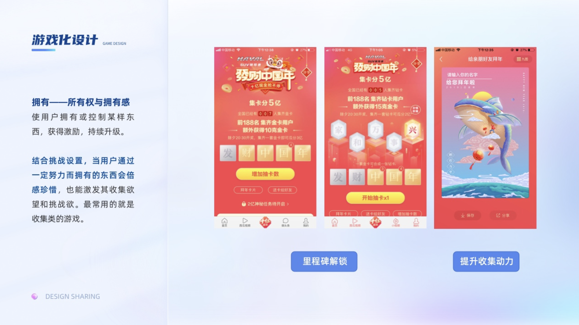 指參與過程中取得進(jìn)步、獲得技能、獲得榮譽,從而獲得成就感,去克服困難達(dá)成目標(biāo)。一般我們會通過證書,勛章,排行榜等去給與用戶成就獎勵。挑戰(zhàn)和技能是促使用戶不斷升級的主要因素,為了讓用戶沉浸其中護(hù)住心流,適當(dāng)?shù)奶魬?zhàn)難度和技能解鎖就顯得尤為重要。挑戰(zhàn)難度高了容易引起用戶的焦慮,難度低了又會讓用戶感覺無聊。比如集卡行動,在考慮總預(yù)算不變的情況下,如何設(shè)置稀有卡的比例,集卡的難度就尤為重要。支付寶集五福在初期,敬業(yè)福的比例比較低,所以用戶抽到敬業(yè)福的體驗就很開心,但隨著支付寶后面為了擴(kuò)大社交屬性,提高了集齊率,集五到五福的興奮感就弱了,導(dǎo)致部分用戶失去動力,因為集到的人越多后續(xù)瓜分的錢就越少。