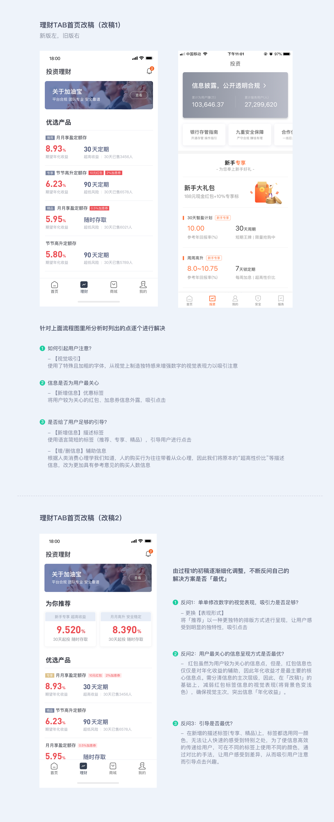 - 接到需求先了解目的,將大目標(biāo)拆分為可執(zhí)行的小目標(biāo)。例如加油寶 APP6.0 改版時(shí),核心目標(biāo)為提升「收益增值業(yè)務(wù)下單率」,拆解為:提升標(biāo)的 item 點(diǎn)擊率→提升「立即投資」按鈕點(diǎn)擊率→提升支付確認(rèn)點(diǎn)擊率。