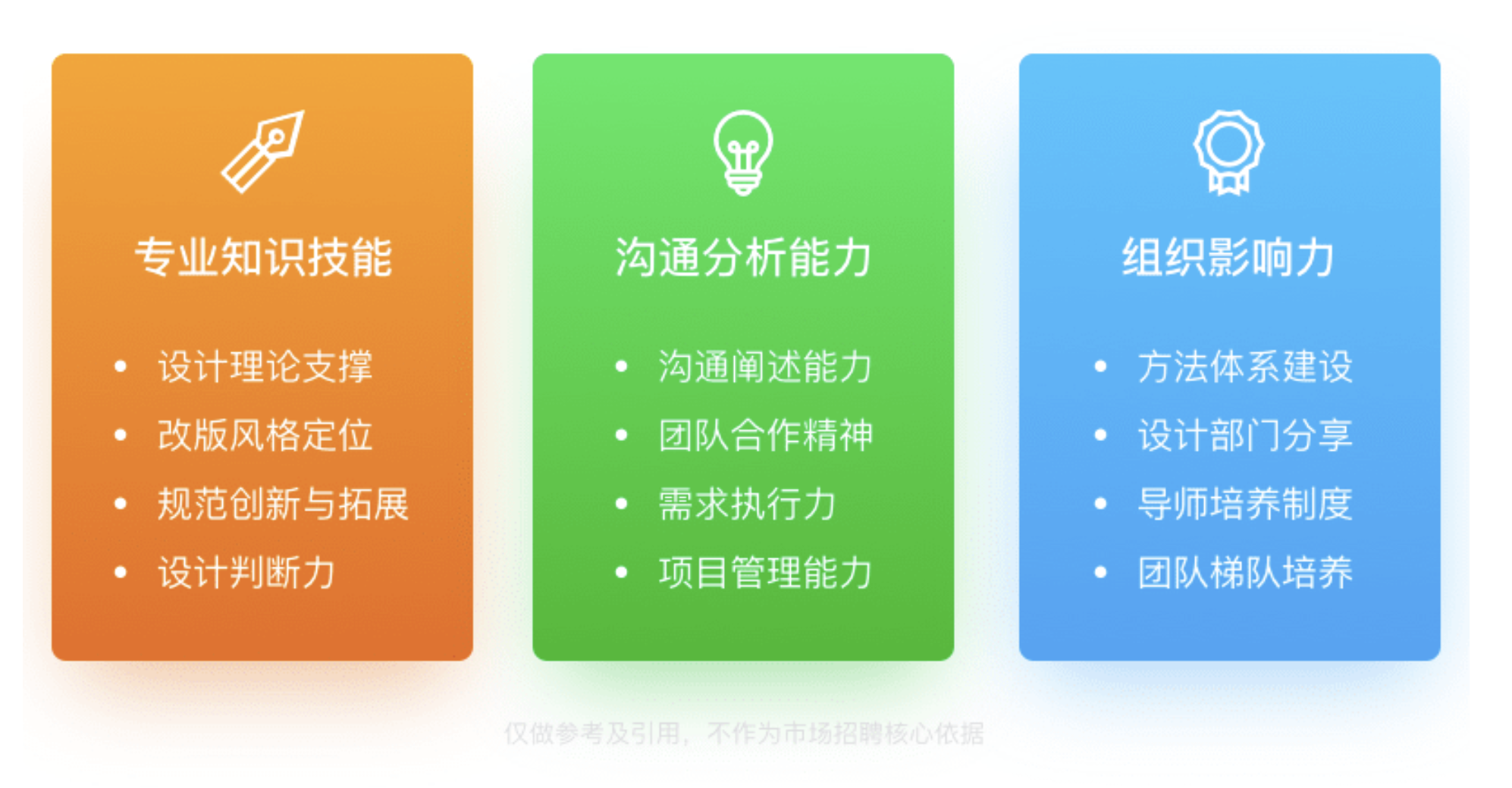 • 溝通分析能力愈發(fā)受重視,例如設(shè)計(jì)師需能解釋設(shè)計(jì)方案的出發(fā)點(diǎn)、布局原因、驗(yàn)證依據(jù)及理論支撐等。以阿里 P6、美團(tuán) P2-3、小米 D2-3 等職級(jí)要求為例,溝通分析能力的重要性甚至超過專業(yè)設(shè)計(jì)能力。