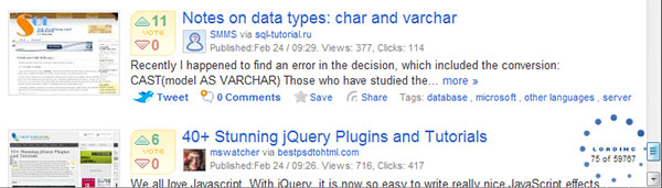 與分頁(yè)相反,連續(xù)滾動(dòng)是一種新型的數(shù)據(jù)顯示方式。這種方式不需要選擇特定的數(shù)據(jù)類(lèi)型,新的數(shù)據(jù)被加到列表里。在加載的時(shí)候顯示進(jìn)度,如下例所示,在dzone.com里,進(jìn)度條顯示有多少項(xiàng)已經(jīng)被加載。
