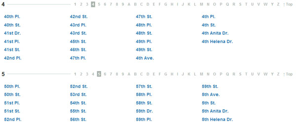 Product Planner 采用了標(biāo)準(zhǔn)的分頁(yè)顯示,有頁(yè)碼數(shù)字,有上一頁(yè)下一頁(yè)。但是,你能告訴我第2頁(yè)是什么? 第3頁(yè)?當(dāng)然你不能。不用擔(dān)心,標(biāo)準(zhǔn)分頁(yè)可以得到改善。如下所示,通訊錄很龐大,他們使用了數(shù)字和字母來(lái)分頁(yè)。在這個(gè)例子里顯示所有的頁(yè)和隱藏頁(yè)一樣好。你可以以此類(lèi)推應(yīng)用到其他條件相似的表格。如果表格以日期來(lái)分類(lèi),你可以以日期范圍來(lái)替代傳統(tǒng)的分頁(yè)數(shù)字(如第1頁(yè)可以寫(xiě)成2.10-2.12,等等)