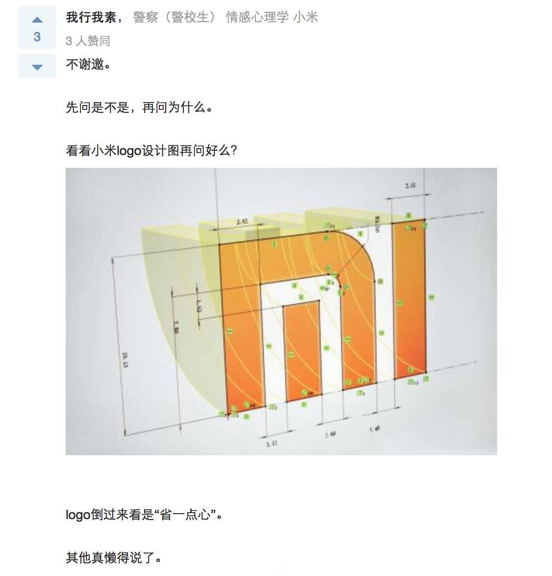 即便小米的LOGO當(dāng)年剛發(fā)布的時(shí)候還是有抄襲或是撞車嫌疑,但從截圖回復(fù)來(lái)看,小米公司內(nèi)部還是對(duì)這個(gè)LOGO認(rèn)可, 但我不覺(jué)得在設(shè)計(jì)之初,設(shè)計(jì)師就知道他設(shè)計(jì)的LOGO倒過(guò)來(lái)還能扯上“心”這個(gè)層面的意思。