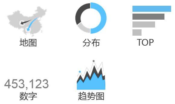 分析清楚數(shù)據(jù)后,就要找個合適的箱子把這些“蘋果”裝進去。上一步,或許還可以靠自身的邏輯能力,采集到的現(xiàn)成數(shù)據(jù)分析得到,而這一步更多地需要經(jīng)驗和閱歷。幸運的是,現(xiàn)在已經(jīng)有很多成熟的圖形可以借鑒了。從和業(yè)務(wù)的溝通了解到,需要匹配的圖形有中國地圖、餅圖、top圖、數(shù)字、趨勢等。