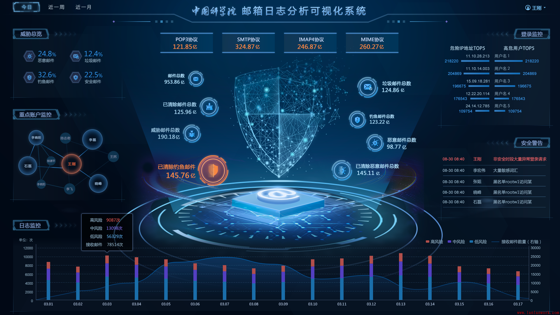 藍藍設(shè)計也在給中科院各個院所設(shè)計界面,上圖是給郵箱日志分析可視化系統(tǒng)設(shè)計的界面概念稿。為了設(shè)計好,我們搜集了各種資料文章和行業(yè)界面參考,了解郵件系統(tǒng)的行業(yè)術(shù)語,畫出交互原型、視覺設(shè)計稿。