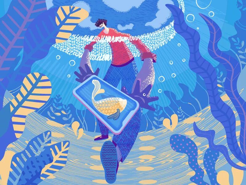 在這個(gè)約會(huì)應(yīng)用的網(wǎng)頁(yè)當(dāng)中,插畫無(wú)疑傳遞出了多重的信息,暗含的隱喻告知了用戶產(chǎn)品的功能和屬性。而下面這幅插畫則是為一篇如何找到原創(chuàng)風(fēng)格的文章所準(zhǔn)備的,圖中的金魚指代的則是難以被抓住的靈感和風(fēng)格。