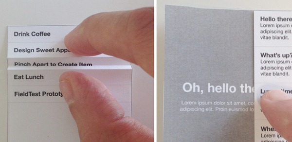 左邊的界面中,通過(guò)紙張的折疊來(lái)模仿 Clear 界面的拉伸添加條目,右邊的界面,則是模仿 Path 中滑動(dòng)展現(xiàn)分層。在把完折紙的過(guò)程中,Juan Sanchez 發(fā)現(xiàn),可以將折疊使用在滑動(dòng)分層上,即將上一層的信息折疊下來(lái),展示下一層的內(nèi)容,是一種很有創(chuàng)意的交互方式。