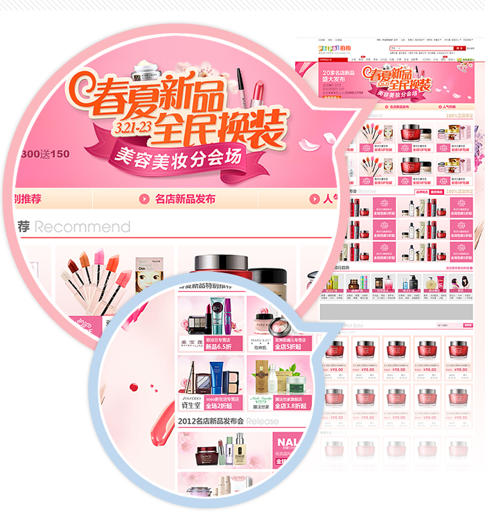3月促化妝品分會(huì)場運(yùn)用粉紅色為主色調(diào),更容易讓人聯(lián)想到粉嫩的肌膚和絢麗的彩妝。大背景使用護(hù)膚品和彩妝用品的特寫展現(xiàn)美容用品的美感,烘托賣場氛圍。