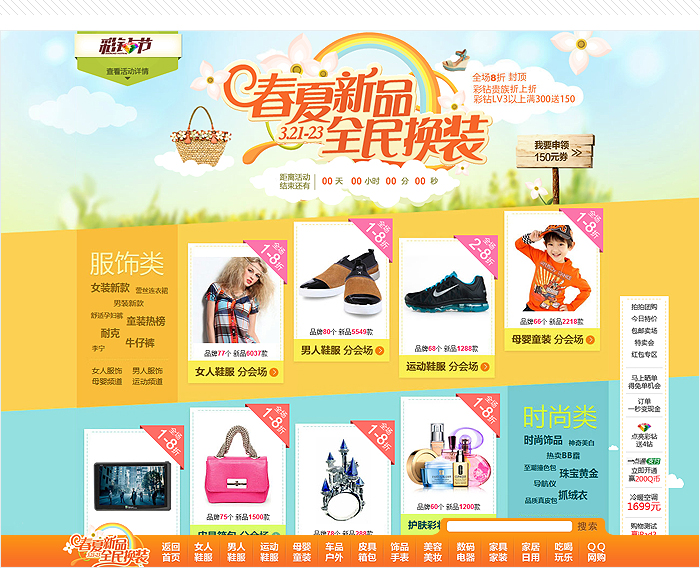 拍拍3月的大型促銷活動(dòng)《春夏新品,全民換裝》,主會(huì)場設(shè)計(jì)上運(yùn)用明快、鮮艷的春夏色彩塊組合,在細(xì)節(jié)上采用花朵草地藍(lán)天更加突顯初春購物的輕松氛圍。并在活動(dòng)頭部主畫面中采用HTML5+CSS3實(shí)現(xiàn)的酷炫動(dòng)畫,為用戶帶來了全新的頁面體驗(yàn)。