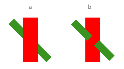 連續(xù)原則 和閉合原則有些類似。以實物形象上的不連續(xù)使瀏覽者產(chǎn)生心理上的連續(xù)知覺。看到a圖,瀏覽者會認為是一個綠色條和一個紅色相交,而事實卻是b圖。
