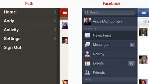 Path和Facebook的app界面,即使右側(cè)只顯示一小部分內(nèi)容,而用戶卻能感知到后面更多的內(nèi)容,并能將導(dǎo)航和內(nèi)容輕易的聯(lián)系起來。