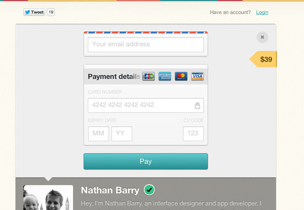 Gumroad在未登錄狀態(tài)的支付表單中剔除了很多常見的“必填”字段,最終只保留了用于輸入郵箱地址、信用卡號(hào)、有效期和CV碼的文本框。如果連未登錄時(shí)的支付環(huán)節(jié)都可以被如此簡(jiǎn)化,我相信對(duì)于其他方面業(yè)務(wù)的那些復(fù)雜表單來說,不會(huì)沒有優(yōu)化空間的。