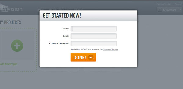 在對(duì)表單進(jìn)行了充分的簡(jiǎn)化之后,我們還可以試著通過一些設(shè)計(jì)技巧讓填寫表單的環(huán)節(jié)看上去更輕量。在這方面,我個(gè)人最喜歡的一個(gè)案例來自原型制作工具InVision的注冊(cè)表單。他們使用浮層的形式呈現(xiàn)表單,作為訪問者,我可以感知到,當(dāng)我填寫完成之后就可以立刻回到之前的界面繼續(xù)應(yīng)用流程。