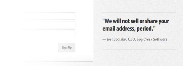 在為訪問者提供積極引導(dǎo)的同時(shí),我們還要想辦法避免掉那些負(fù)面因素。人們?cè)谔顚懕韱螘r(shí)的最大顧慮就是信息被網(wǎng)站方收集之后的用途。用戶不會(huì)希望收到垃圾郵件,更不愿意自己的個(gè)人信息被傳播出去。如果你確實(shí)運(yùn)營(yíng)著一個(gè)值得信賴的產(chǎn)品,那么不妨直接讓用戶知道你不會(huì)把他們的信息販賣出去或是向他們發(fā)送垃圾郵件,就像FogBugz做的那樣,在注冊(cè)表單旁邊以非常直白的口語化的方式告訴用戶“我們不會(huì)出售或分享你的郵箱地址,就是這樣。”