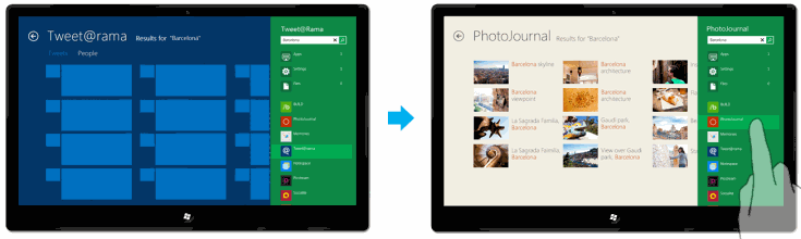 如上圖所示,用戶當前處于Tweet@Rama 應用的環(huán)境當中,出于某種需求,該用戶希望搜索相片應用當中所有包含“Barcelona”關鍵詞的相片。輸入了關鍵詞之后,用戶在搜索托盤中選擇相片應用,使其成為搜索結果提供者,這時相片應用就會自動加載,并顯示相關的搜索結果。這種方式使得用戶無需手動在當前運行的應用與搜索目標應用之間進行切換。