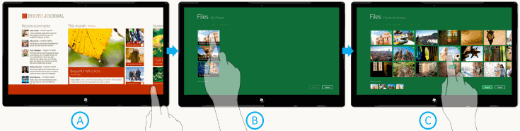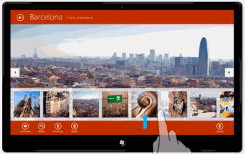 無論在iOS還是Windows中,這兩個手勢在很多時候都被用作放大或縮小內容對象的尺寸。不過對于Metro應用來說,它們還可以通過Semantic Zoom來實現(xiàn)內容層級間的導航。用戶可以捏合某個內容對象,來進入它所在的相關內容組。不過,當用戶正在以全屏模式瀏覽單張相片的時候,捏合與張開的手勢還是會被用來調整圖片的尺寸。