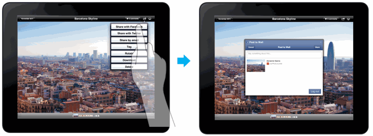iPad版本:用戶需要點擊導航欄右側的相關動作按鈕,并從展開的列表中選擇“分享到Facebook”。如果要使應用支持更多的分享服務,開發(fā)人員必須在該應用當中逐一增添。