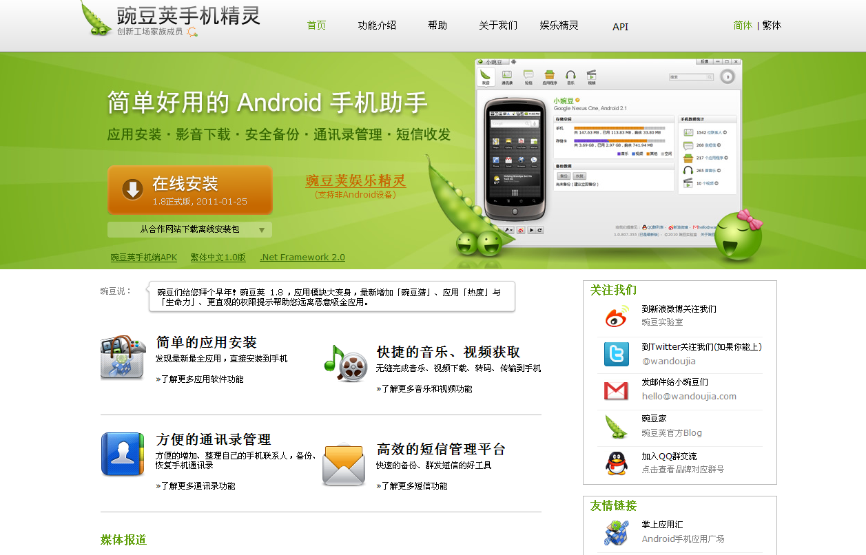 5 豌豆莢手機精靈官網(wǎng),非常實用的應(yīng)用軟件類布局,功能、關(guān)注、宣傳、友鏈布局合理,大大的焦點圖上書:在線安裝,用戶下載方便。該有的都有,所以在意料之中,相對平常。