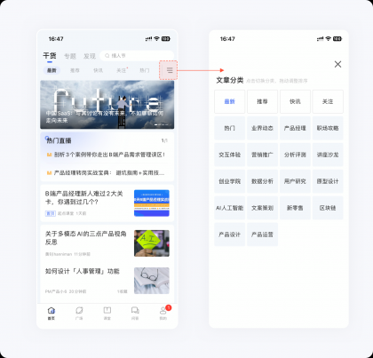 2.1.3設(shè)計(jì)亮點(diǎn):滑動(dòng)屏幕頂導(dǎo)隱藏與出現(xiàn)交互當(dāng)用戶滑動(dòng)屏幕時(shí),頂部操作區(qū)會(huì)跟隨手勢(shì)進(jìn)行向上隱藏,這樣可以在用戶向上滑動(dòng)瀏覽信息時(shí)給界面帶來(lái)更多的展示空間,當(dāng)用戶向下滑動(dòng)一定距離時(shí)頂導(dǎo)出現(xiàn),方便用戶對(duì)頂導(dǎo)進(jìn)行相關(guān)操作。這里的交互細(xì)節(jié)很舒適,大家可以多多學(xué)習(xí)。