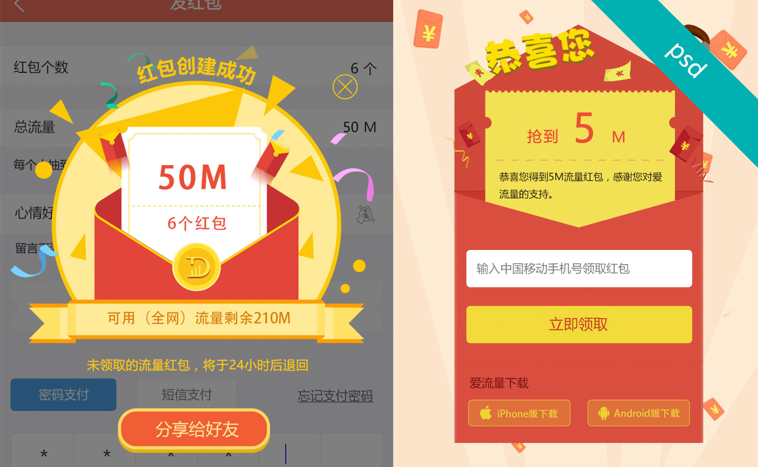 手機(jī)APP發(fā)紅包及搶紅包兩頁(yè)psd