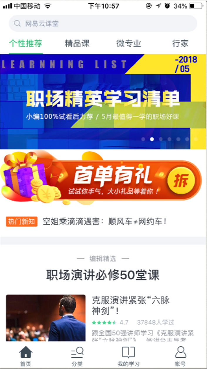 1.首頁根據(jù)產(chǎn)品的不同特色,設(shè)置了二級導(dǎo)航,將個性化、精品課、微專 業(yè)、行家作為二級導(dǎo)航標(biāo)題,既能用來統(tǒng)一呈現(xiàn)特色內(nèi)容,又能保證頁面信息的 層級關(guān)系清晰明了;