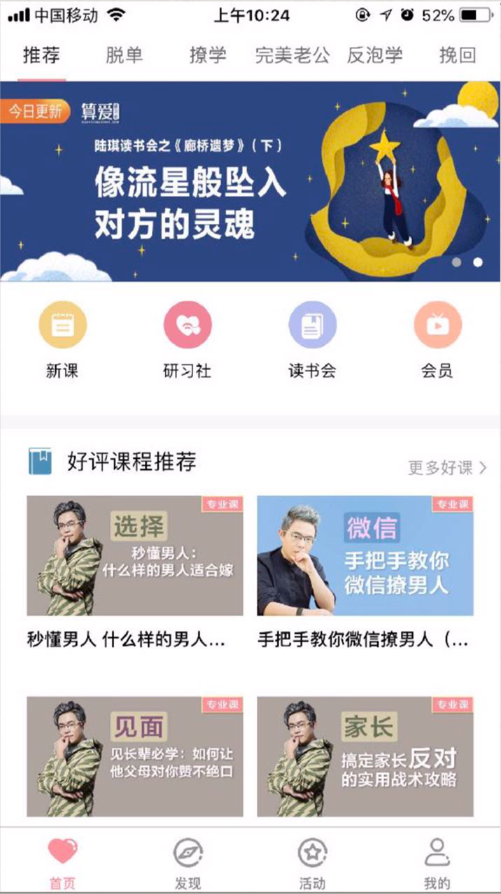 1.首頁根據(jù)產(chǎn)品的不同特色,設(shè)置了二級導(dǎo)航,將、脫單、撩學(xué)、完美老公、 反泡學(xué)、挽回等分類作為二級導(dǎo)航標(biāo)題,既能用來統(tǒng)一呈現(xiàn)特色內(nèi)容,又能保證頁 面信息的層級關(guān)系清晰明了;
